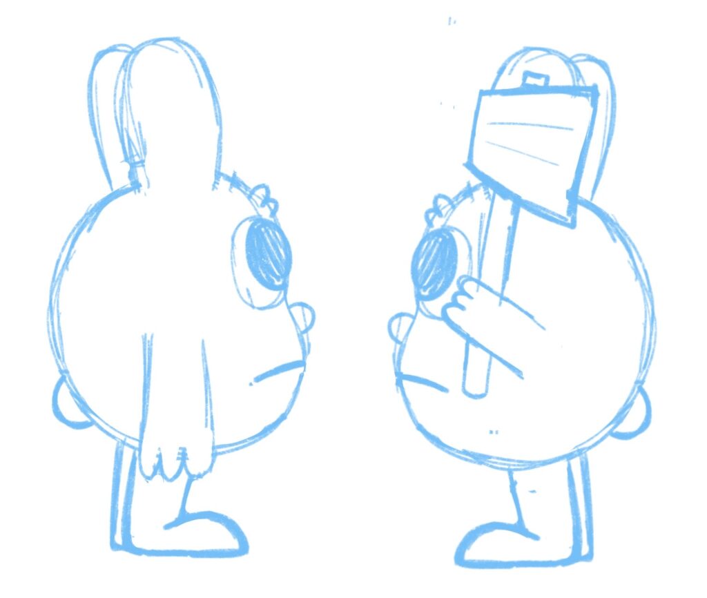 During the transition from 2D to 3D, a significant challenge we encountered was accommodating the character’s large eyes on its bean-shaped body. In its original 2D form, the character’s elongated eyes were effective; however, in 3D, they risked being obscured by the lower part of the body. I proposed several solutions to Blake (pictured above), and ultimately, we opted to shorten the eyes slightly and introduce a small socket to maintain the body’s original shape for the final design.